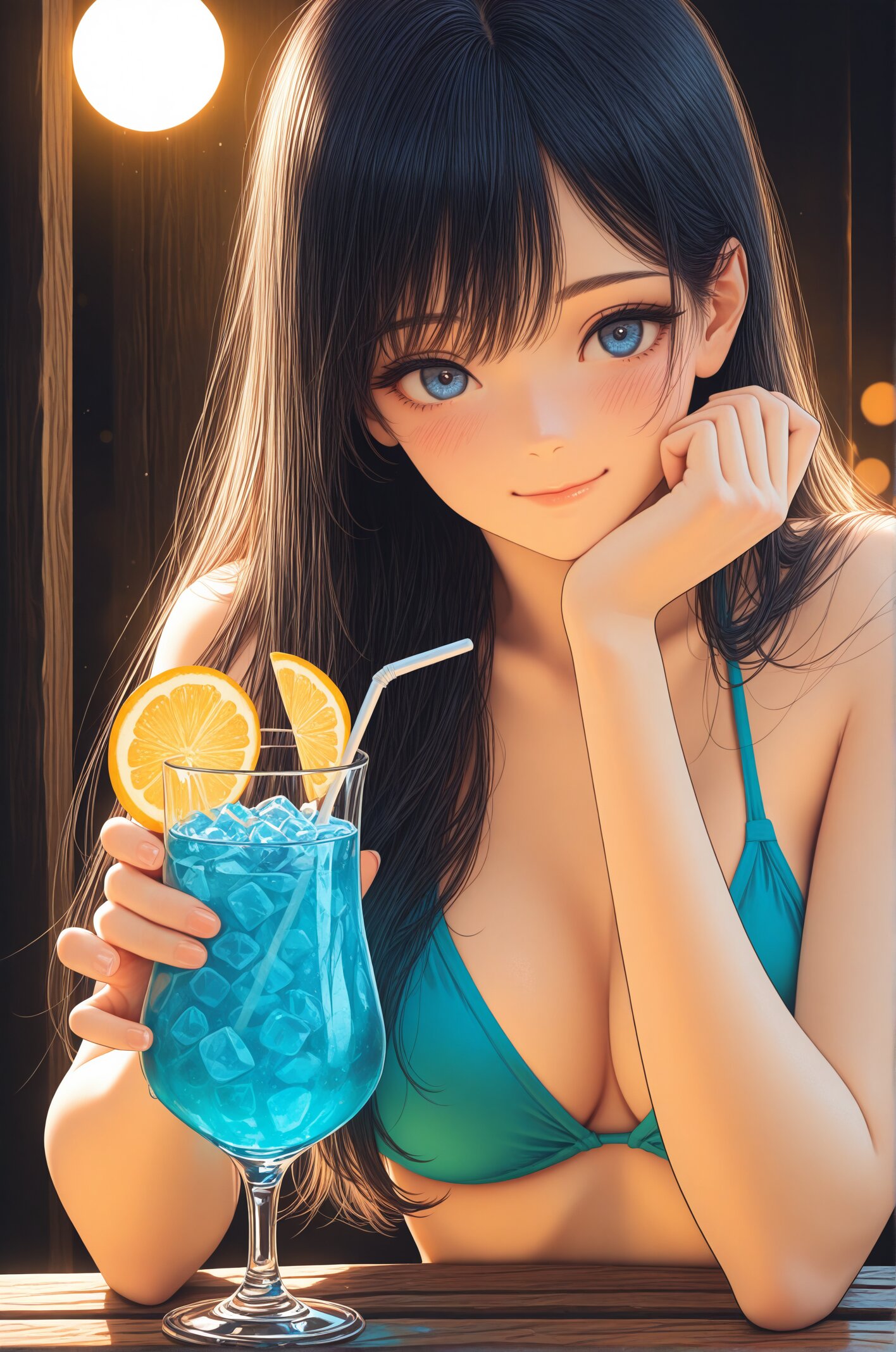 (long black hair:1.5),(blue eyes),(calm smile:1.3),(medium breasts),(upper body), bikini, holding blue drink, glass, ice, straw, (rim lighting:1.4) masterpiece, best quality, ultra-detailed, 8k resolution, very aesthetic, <lora:StS-Illustrious-Detail-Slider-v1.0:2.> <lora:sdxl-hairdetailer_02:2> <lora:mdk_manga_illus_1024:0.2>