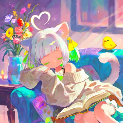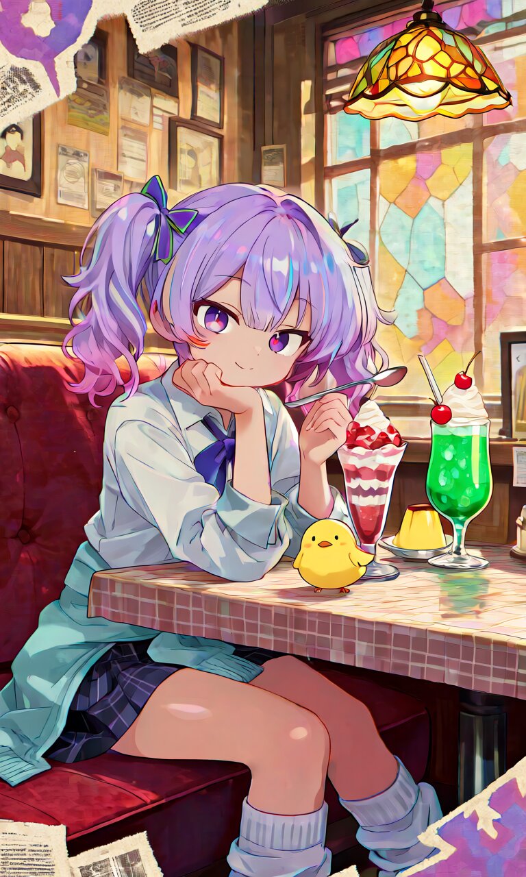 masterpiece, best quality, ultra detailed, highres, 1girl, solo, Touka (original character), geometric aesthetic, gyaru, twintails, hair ribbon, light purple hair, multicolored streaked hair, gradient hair, purple eyes, big eyes, tsurime, cute face, fair skin, petite, slender, wearing a retro-style school uniform (blouse, skirt), vintage-inspired details, slightly loose socks, sitting inside a traditional Japanese kissaten (retro cafe), wooden interior, warm lighting, velvet sofa, checkered tablecloth, stained glass lamp, antique decorations, cream soda with cherry, parfait, or pudding on the table, glass with condensation, soft smile, relaxed pose, holding a spoon or straw, slightly playful expression, small yellow chick (baby chicken) sitting on the table or near the dessert, warm ambient lighting, nostalgic atmosphere, golden tones, soft shadows, subtle geometric light reflections faintly appearing in glass or air, blending retro and modern aesthetic, film grain, slight color fade, soft focus, cinematic composition, anime style, clean linework