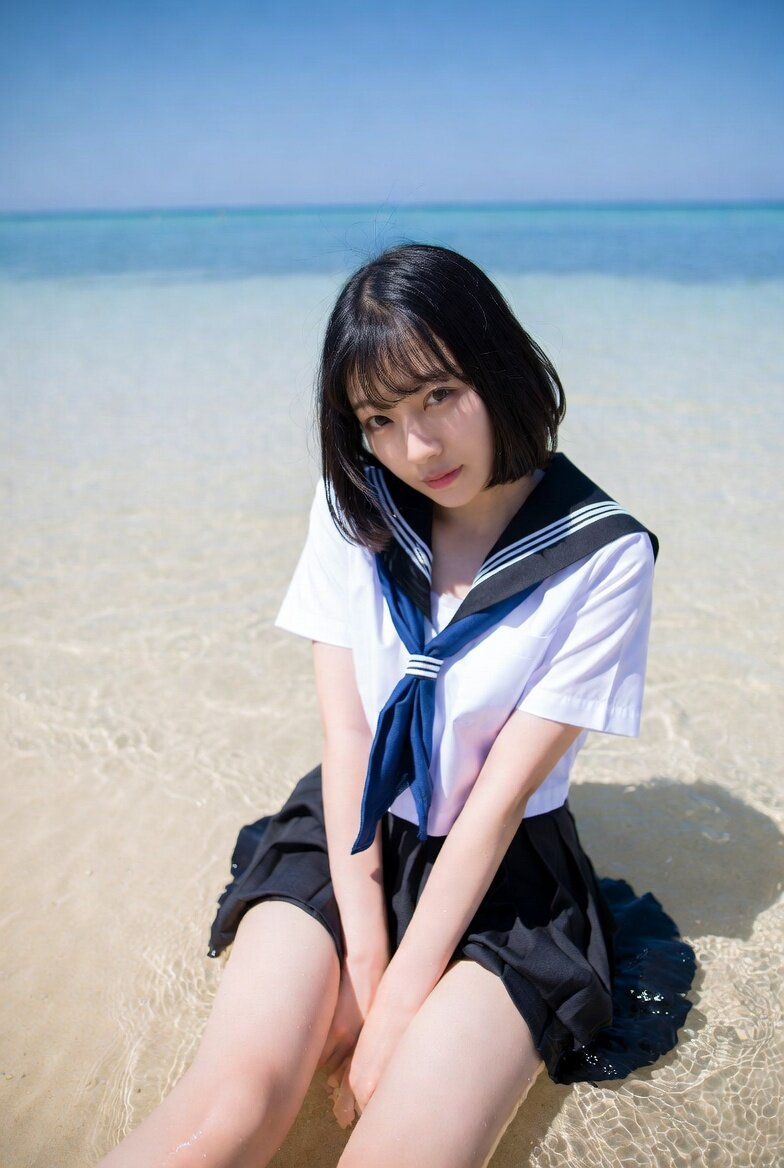 日本の女性20歳のリアルなフォト。プロのカメラマンによる撮影のような仕上がり。セーラー服、白い半袖夏服、紺のスカーフ、黒いプリーツスカート、膝上丈、晴れた青空、夏の自然光。キレイな砂浜で海に入って座っている。高い位置からの見下ろす画角。