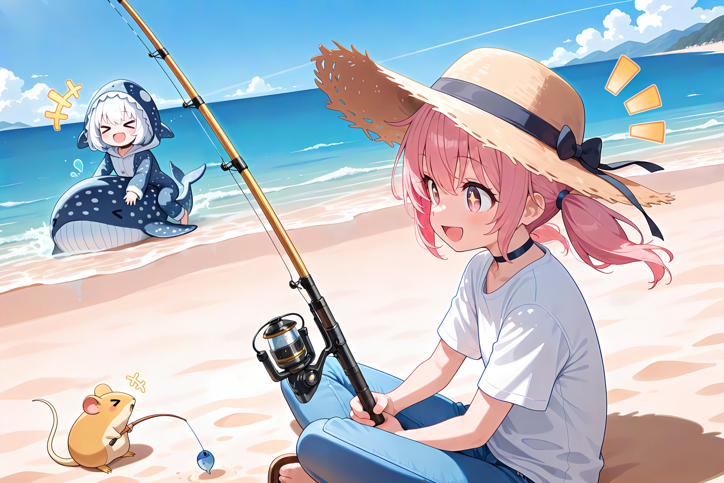 1 little girl, solo, upper body, diagonal angle, masterpiece, best quality, amazing quality, very aesthetic, white hair, short hair, > <, open mouth, smile, cheerful, +++, notice lines, choker, whale shark pajamas, hood on, riding, whale shark, > <, holding fishing rod, fishing reel, hamsters, > <, wind,sand beach, sea, sunny, BREAK 1 little girl, solo, upper body, diagonal angle, from side, masterpiece, best quality, amazing quality, very aesthetic, pink hair, twintails, pink eyes, +_+, open mouth, smile, cheerful, +++, notice lines, choker, white t-shirt, blue jeans, straw hat, fishing, sitting on beach, indian style, holding fishing rod, fishing reel, hamsters, > <, wind,sand beach, sea, sunny,