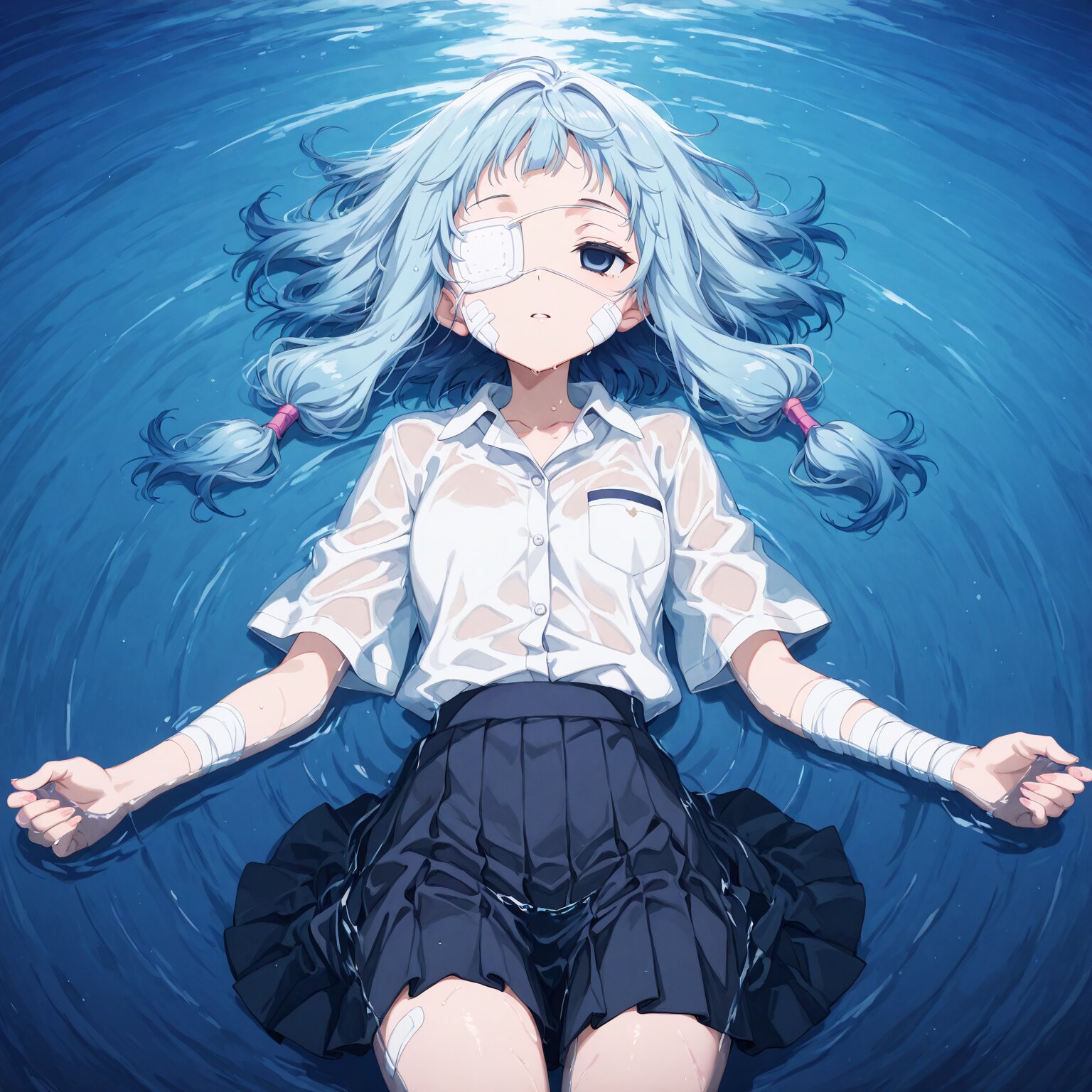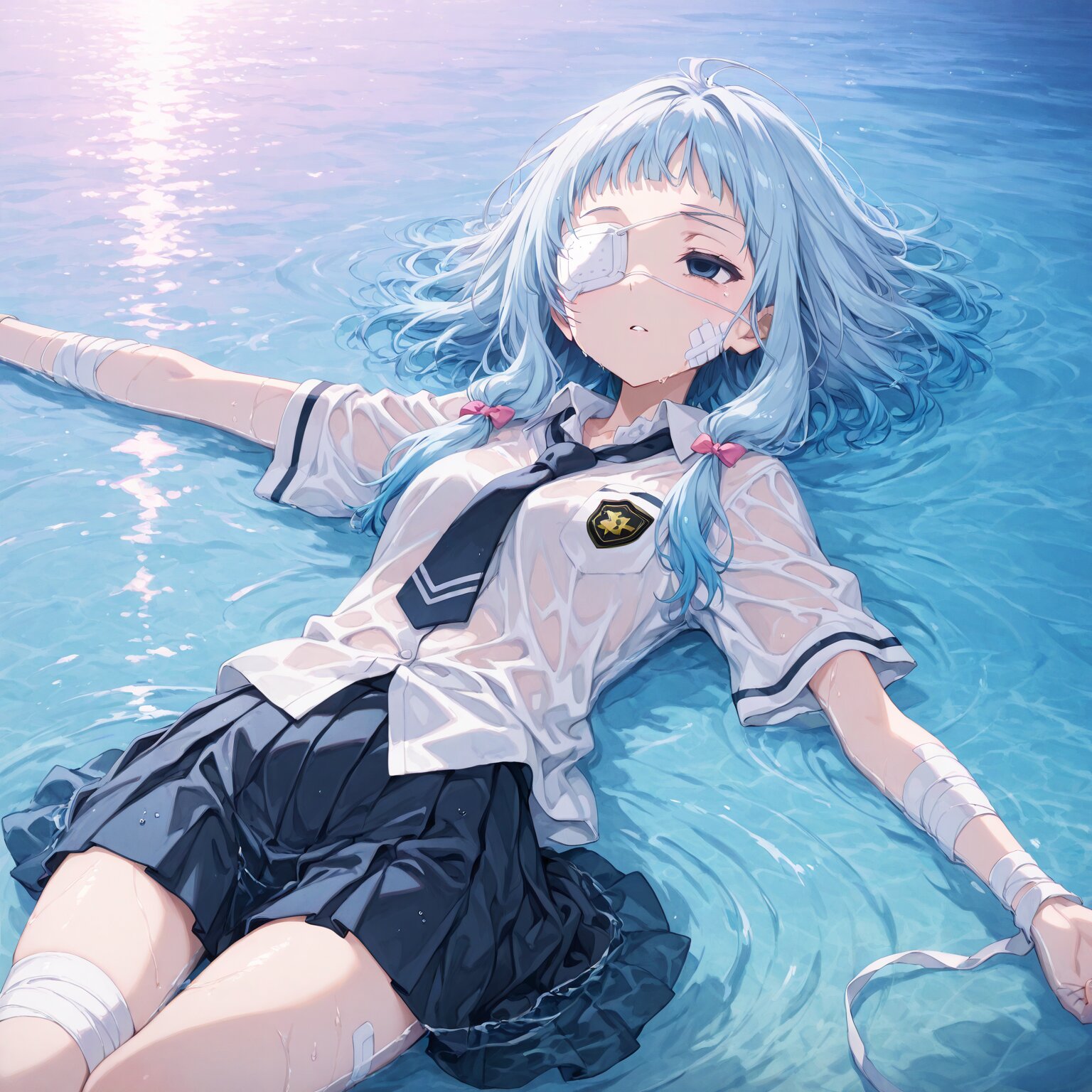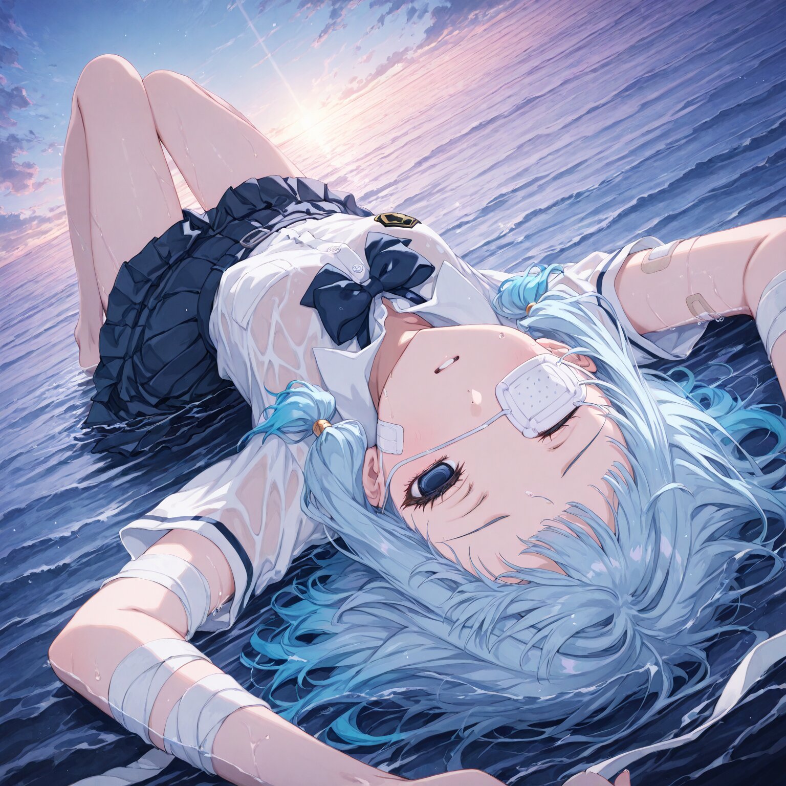 (1girl), BREAK, Deep blue hair, blue to light blue gradient hair, short bangs, (medium length hair), low-tied sidelocks, bandages, bandages on face, blue eyes, (droopy eyes, vacant eyes, rape eyes:1.3), (white medical eyepatch on right eye: 1.3) bandages on arms, bandages on legs, adhesive plasters School uniform, dress shirt, tie Pleated skirts, Floating on the sea, vast ocean, on his back, Wet body, wet hair, whole body floating in water outdoors, daytime BREAK, (newest, anime, animation, anime screen capture, anime style:1.3) BREAK, (masterpiece, , vibrant, very aesthetic, highly detailed, best quality, 16k:1.3)